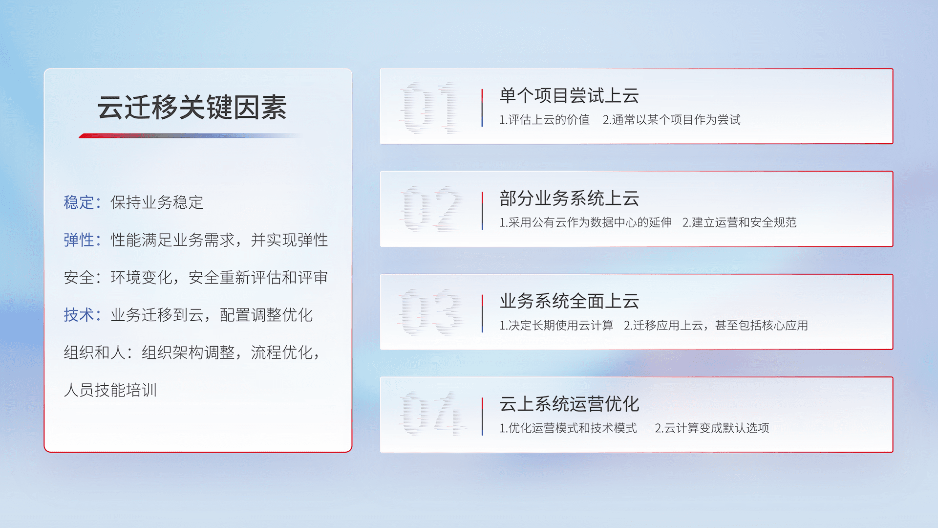 结合实际业务,,,,从规划设计、、、云平台选型、、、、云原生改造、、、、数据迁移、、、集成交付,,,迁移全过程为客户识别最佳上云路径,,做好风险识别管理,,,,设计网络架构、、、身份权限、、安全审计合规、、操作审计、、、、日志审计、、、、监控告警策略、、、多站点容灾设计等,,对云上基础设施进行整体规划,,,提升IT治理水平,,,以满足弹性、、、高可用、、、高性能的需求。。